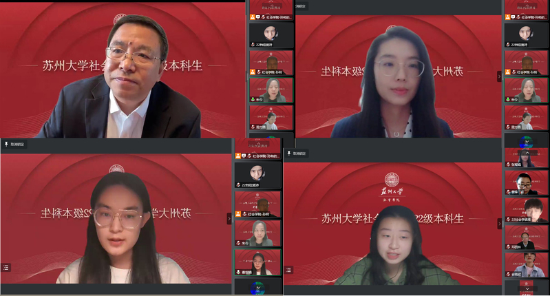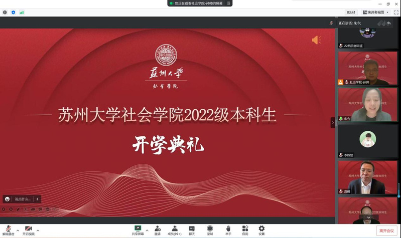 2022年10月29日上午9时30分,苏州大学社会学院2022级本科生开学典礼在线上召开。社会学院院长高峰、党委书记邓国林、副院长黄鸿山、宋言奇、裔洪根,教师代表张程娟,各系主任、新生班主任以及全体辅导员出席了开学典礼,全体2022级本科新生参加了此次典礼。典礼由学院党委副书记兼副院长朱今主持。
