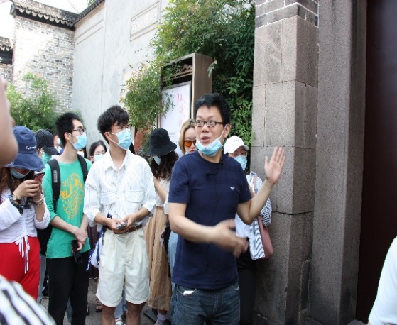 沿着白公祠进入山塘街,便是商业开发程度较高的东段,但我们仍然可以看到明清以来留下的历史建置。首先印入眼帘的便是“会馆弄”,黄老师讲解了明清到近代以来山塘街会馆发展的历史,同学们沿路可以看到包括汀州会馆、宝安会馆、岭南会馆、陕西会馆、山东会馆等多处遗迹,由此,加深了对山塘街繁华商业的感受。此外,还看到山塘河边商业会馆“专属码头”,想象昔日贸易景象。