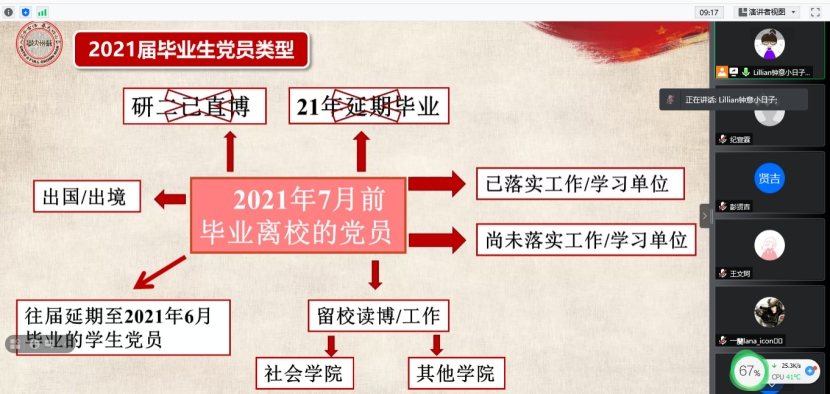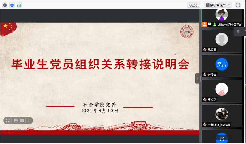 为有序推进毕业生党员组织关系转接工作,强化管理规范,为毕业生提供服务与相关指导。2021年6月10日中午,苏州大学社会学院以腾讯会议的形式组织召开了2021届毕业生党员组织关系转接说明会。此次会议由社会学院组织员李玲老师主持,社会学院2021届全体本科与研究生毕业生党员参加。