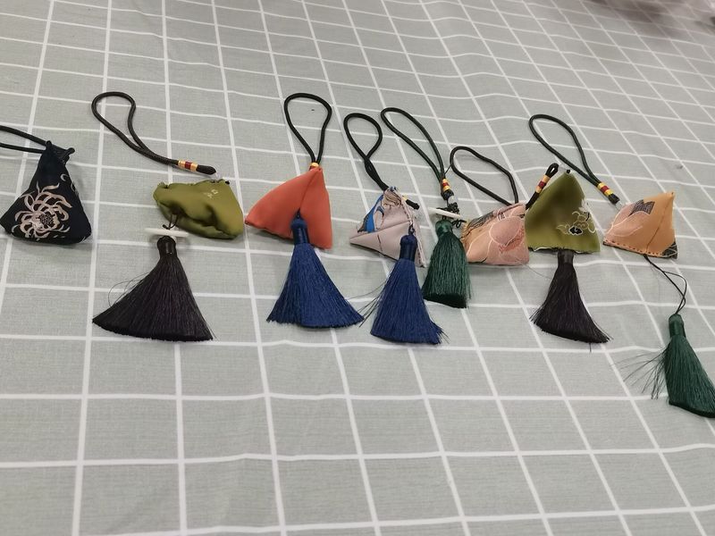 志愿者们共同观看完香包的制作视频后,就开始亲自动手了。别看香囊是个小物件,彩色布料、香料、流苏等各种制作材料,要想做的精细,也需要一针一线、一心一意地慢慢做。制作香包时,首先要把香囊布对折,把挂绳放入布料正中间后缝合,下口不缝,做返口,从返口处翻过来。接着放入香料填充,整理对齐成三角状,藏针或卷针缝合返口出。最后整理每一个角落,底部最中间位置缝上流苏,剪去线头。在制作的过程中,有的同学针线活比较好,大家互帮互助,互学互教,或是娴熟,或是生硬地进行,“第一针从哪里入手呀?”、“这个流苏要怎么缝上去?”……求援声夹杂着欢笑声,不久,一个个三角形状的香囊在志愿者们的巧手下逐渐成形。香囊制作完成后,大家互相赠送,赠人“香囊”,手留余香。那一针一线下的香囊,或如金丝藤萝般华丽,或是绿蓝的颜色俏皮可爱,缝的是情怀,缝在里面的香料是端午节传统文化的凝聚。
