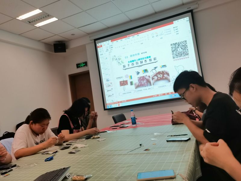 “彩线轻缠红玉臂,小符斜挂绿云鬓”,端午节有佩戴香囊驱邪的习俗。香包,古人叫香囊,用艾叶、藿香等具有芳香除湿除虫功效的中药材料粉末填充。活动开始之前,本次志愿活动的负责人先在投影仪上用PPT向其他志愿者们展示本次志愿活动的活动背景、活动目的和香包的制作步骤。通过PPT,志愿者们了解到了端午节的渊源以及传统香包中的香料组成。